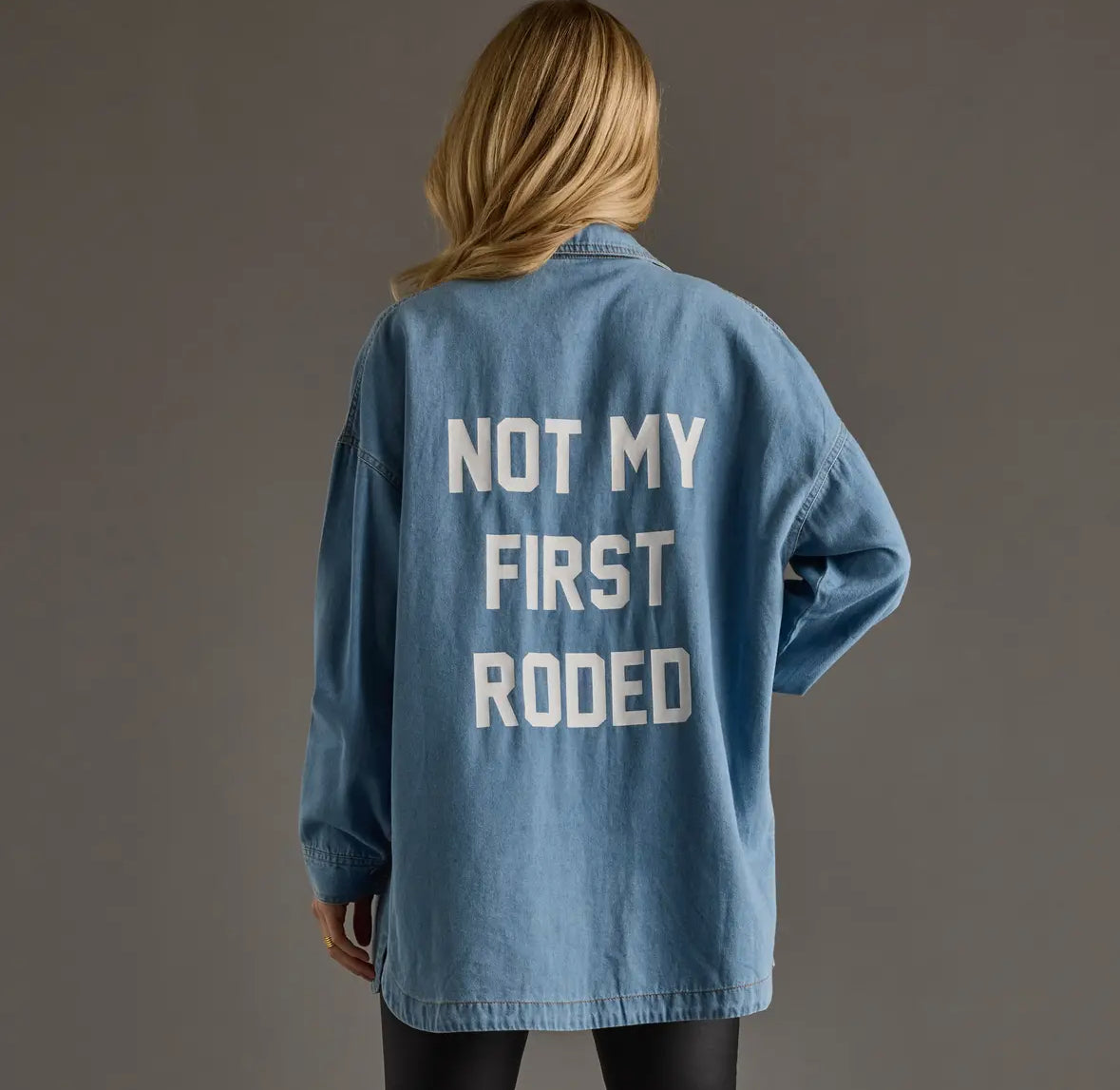 Light Blue Denim Button Up White “Not My First Rodeo” text on the back Soft washed denim fabric, relaxed fit Button-up front with long sleeves and curved hem 75% Cotton, 25% Polyester